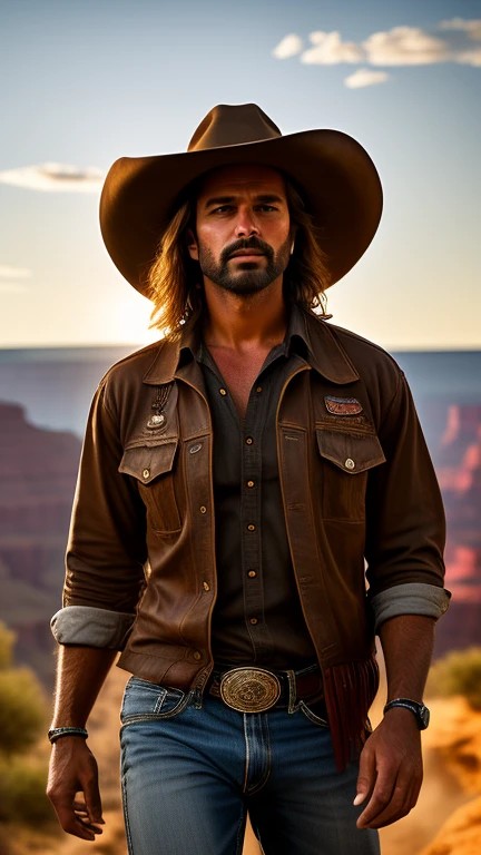 (((Photorealistic))) Cowboy portrait, Wild West, Grand Canyon, dusty trails, wide-brimmed hat, muscular mustang, steely gaze, scorching noon, setting sun, jingling spurs, whistling bullets, rowdy towns, lawless duels,