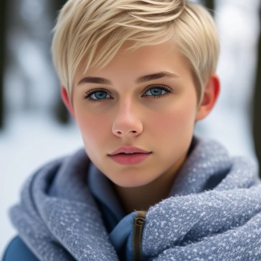 (very attractive 18 year old girl), ((Very short blonde pixie hair: 1.2)),in snow, natural look, blue eyes, upper torso portrait, blurred background, (trimmed pubic hair: 1.1) natural light, photograph, detailed, photorealistic