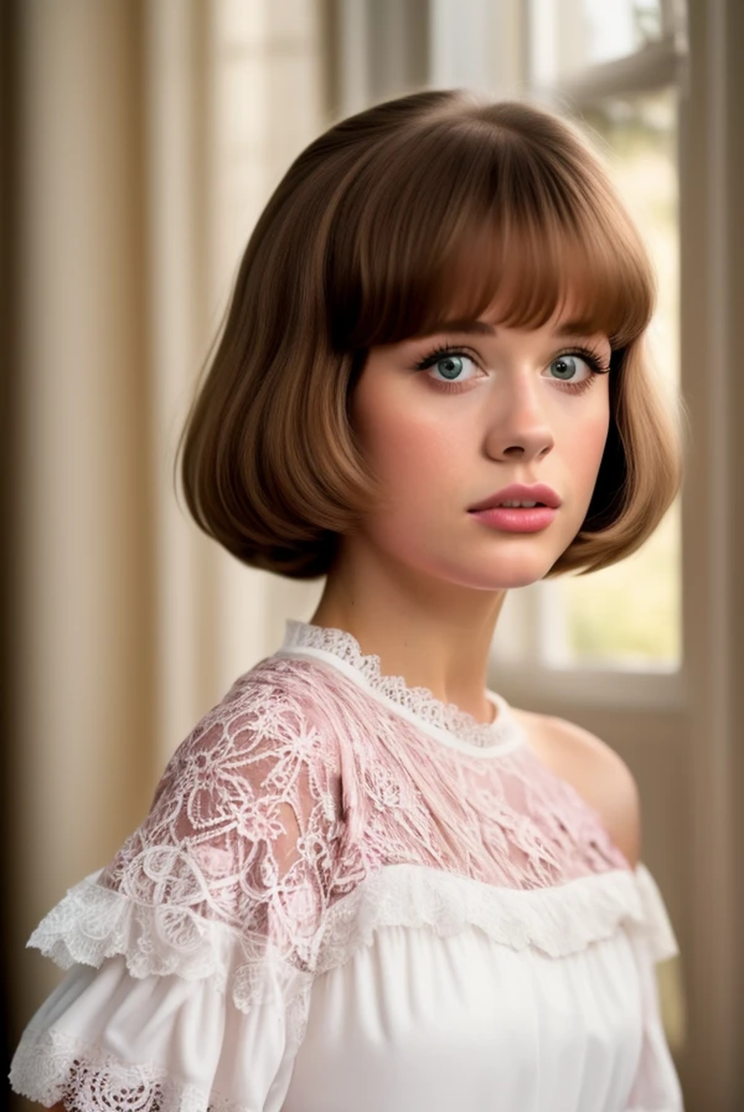 (Three-light studio strobe set-up, 5400K warm light temperature) 8K UHD (((highly-detailed, in-focus close-up))) of (a happy, smiling young woman), (((((wearing an ornate and beautiful white Venetian-lace blouse, rendered with perfect detail and high-resolution))))) and ((professionally-applied glamour-model makeup)))). She has (average lips), and a (slight overbite), with ((((the front two incisors in the top row sitting slightly forward of the rest, making them appear larger and quite prominent -- similar to the teeth of model Noelle Brown, circa 2016)))). ((((Her eyes are unusually large, round, and bright, giving her a literal "wide-eyed look" as she looks directly at the camera)))). Eyes are (((((pale blue, perfectly formed, with perfect round irises; dark, round pupils that have a diameter 40% the diameter of the irises; pupils perfectly centered in the irises))))), plus ((accurate reflections in the eyes)). Their beauty is enhanced by (((dark bronze "smokey eye" eye shadow))), and ((((a wide, dark swath of black eyeliner extending 1/4" past the outer edge of her eyelids)))). ((((The complex colors and radial striations, or stroma, of her irises are visible, as well as small specks of gray in her irises)). She is eighteen years old, lean, and athletic. She has ((((sleek, bright Nordic-blonde hair)))); ((pink lipstick)), (((healthy skin supplemented with a very light-toned foundation, giving her skin a pale, milky and flawless look, with rosy cheeks from dark pink blush))); (((mascara))) and is (((((wearing her shoulder-length hair in a 1970s-style pageboy, similar to the style Dorothy Hamill was known for))))). Facially, she's a mix of (Melanie Laurent 1.3), (Lydia Bielen 1.9), (Zooey Deschanel 1.2) and (a young Agnetha Fältskog 1.9), with (the perfect high-definition eyes of Elle Trowbridge 1.9), (the eyelashes of Marie Osmond 1.9), (the clear, pale skin of Elle Dowling 1.9) (the nose of Olivia Newton-John 1.9) and ((the mouth and teeth of Noelle Brown 1.9)).