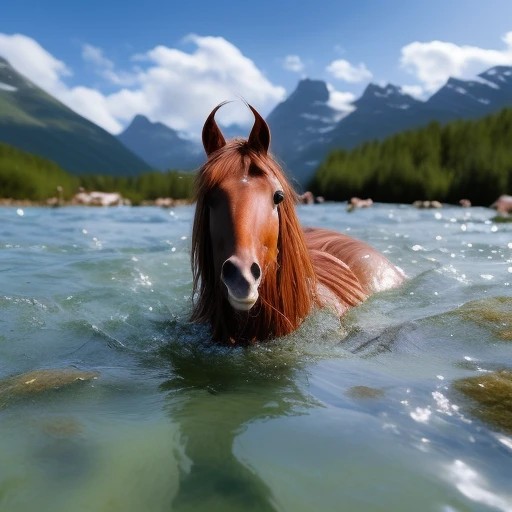 Un cheval brun dans l’eau avec un paysage de montagne ensoleillé avec des jeunes filles qui se baignent en bikini