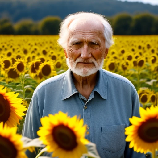 old caucasian man with short hair in sunflower field