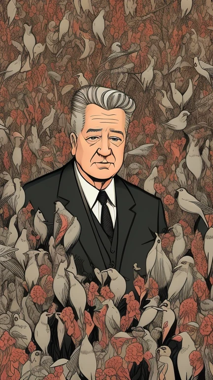 David Lynch mixed with Alfred Hitchcock surrounded by birds