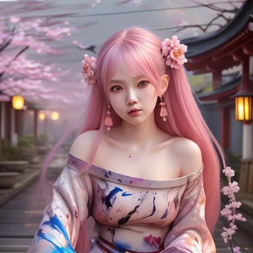 1girl, (ulzzang-6500:0.7), kpop idol, yae miko, detached sleeves, bare shoulders, pink hair, long hair, japanese clothes, best quality, (painting:1.5), (hair ornament:1.35), jewelry, purple eyes, earrings, breasts, torii, cherry blossoms, lantern light, depth of field, detailed face, face focus, ribbon_trim, (looking at viewer:1.25), nontraditional miko, shiny skin, long sleeves, smile, thick lips, game cg, hands on lips, east asian architecture, (blurry background:1.2), sitting, upper body,