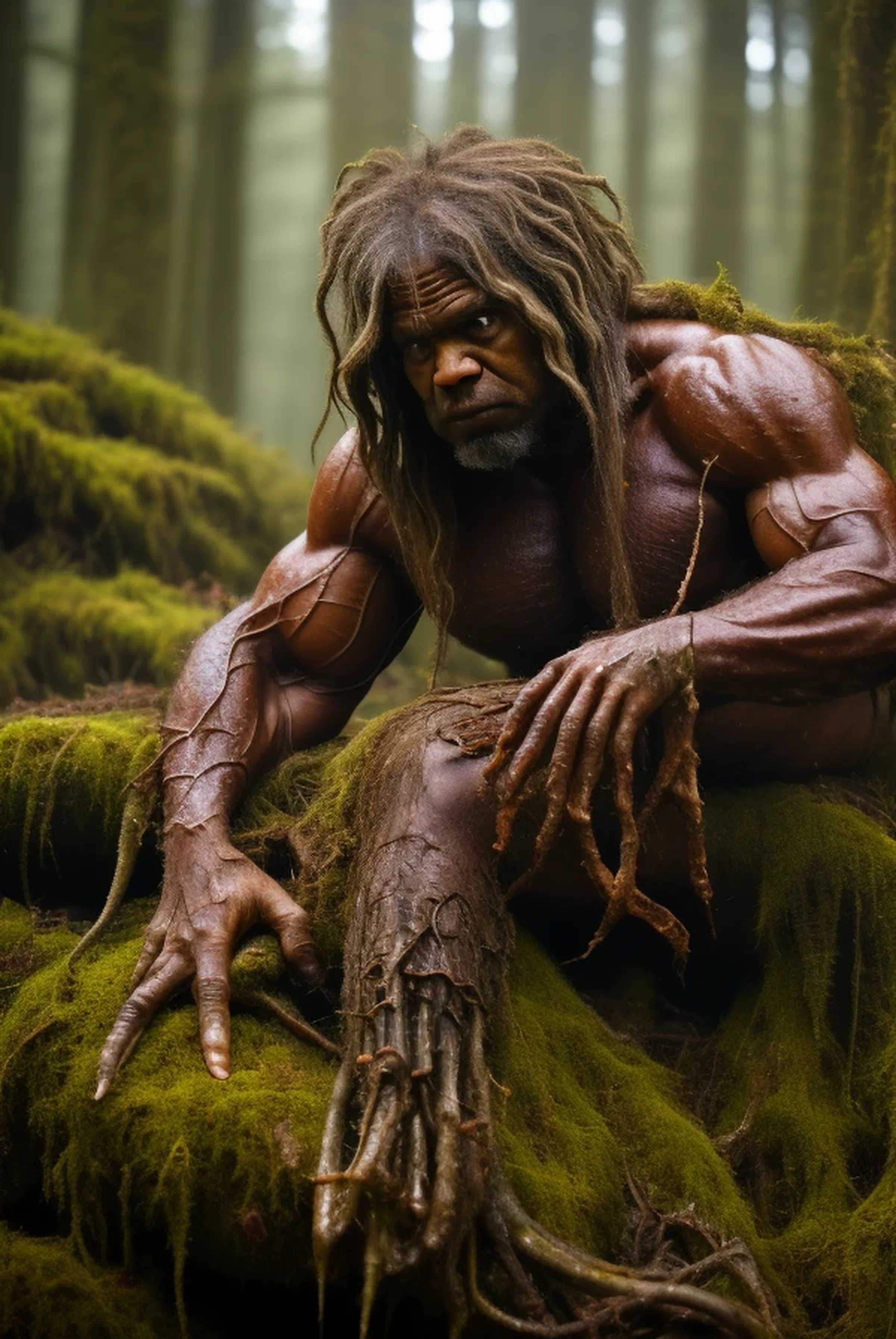 ((A muscular middle-aged man sitting on a boulder in the forest, slowly merging with his surroundings. Instead of legs, he has thick roots that extend from his hips and reach down into the swampy ground.)) ((His skin is covered with lichen and moss, and his long hair resembles dark, thorny vines more than hair)). ((He has no eyes or mouth -- just empty expanses of skin with thick veins forming thick ridges under the skin.)) ((Large worm-like things are slithering out of the wide, dark hole where his nose should be, like his head is hollow and he is half-rotted inside)). ((Painted in the biomechanical style of H.R. Giger))