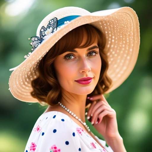 mom wearing a white polka-dot dress and wide brimmed straw-hat riding a 1960s motor scooter ((Photorealistic)), ((Detailed Face)), ((High Cheekbones)), ((Detailed Hands)), ((Feminine Hands)), ((Action Poses)), ((8k)), ((uhd))