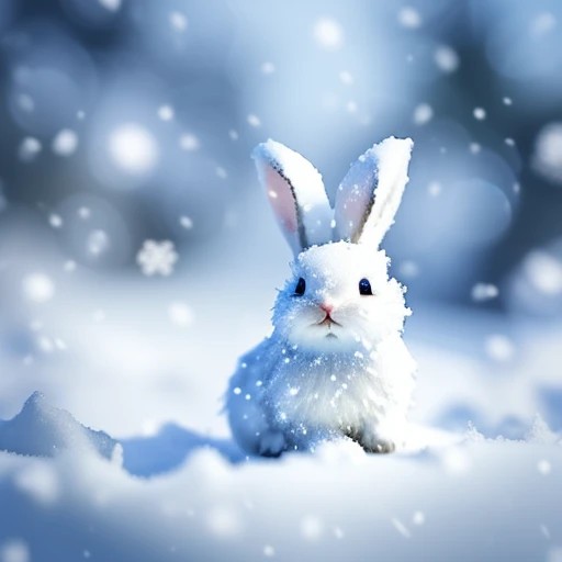 small snow white bunny in a snowy valley and small snowflakes