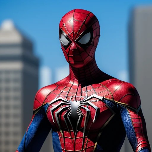 a superhero, similar to spiderman, with an "AI" logo written on his chest, standing proudly with the background of a developing and dynamic society, on a sunny day