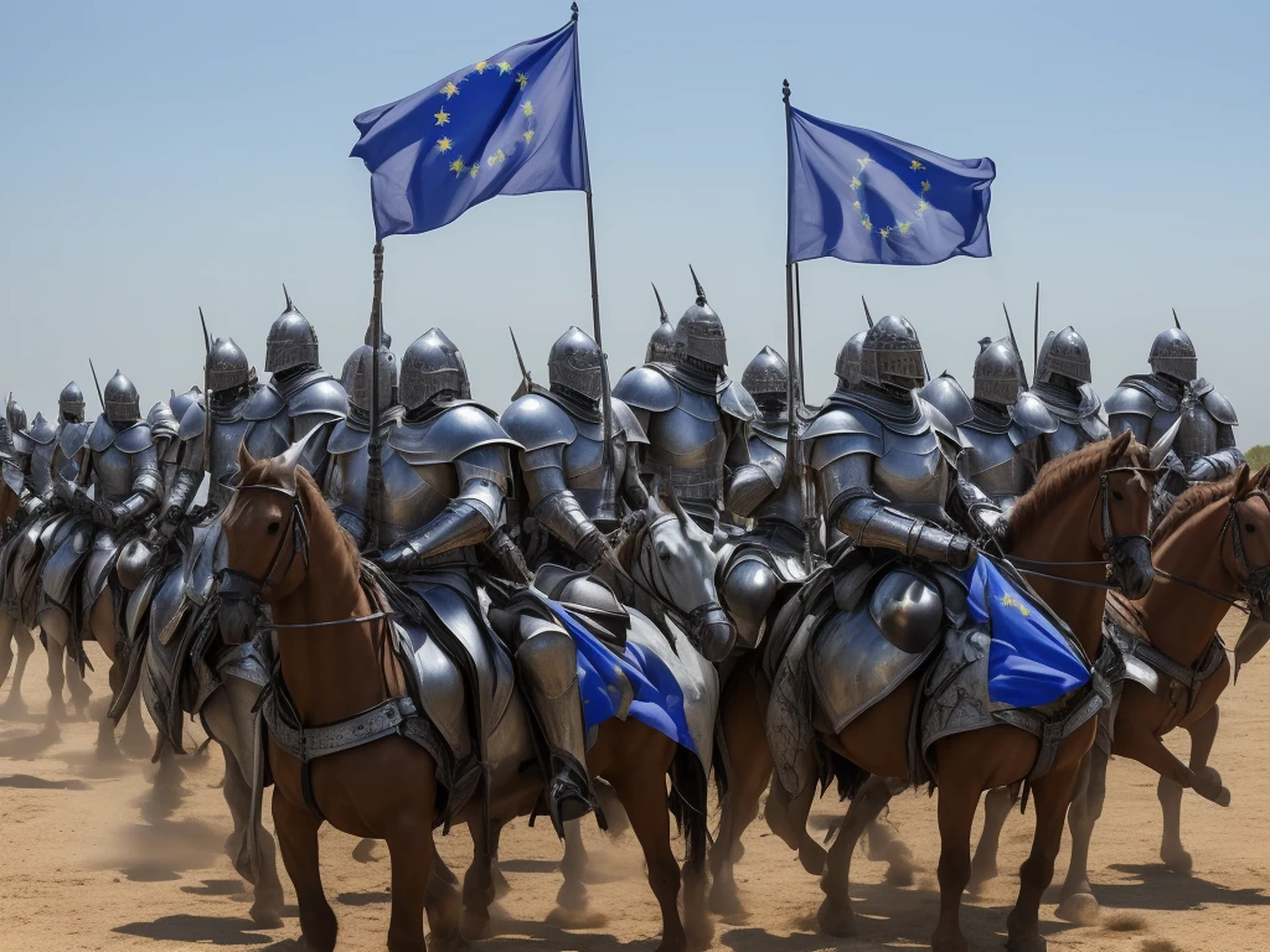 10 Heavy armored knights crusaders on horses on gallop, with EU flag.