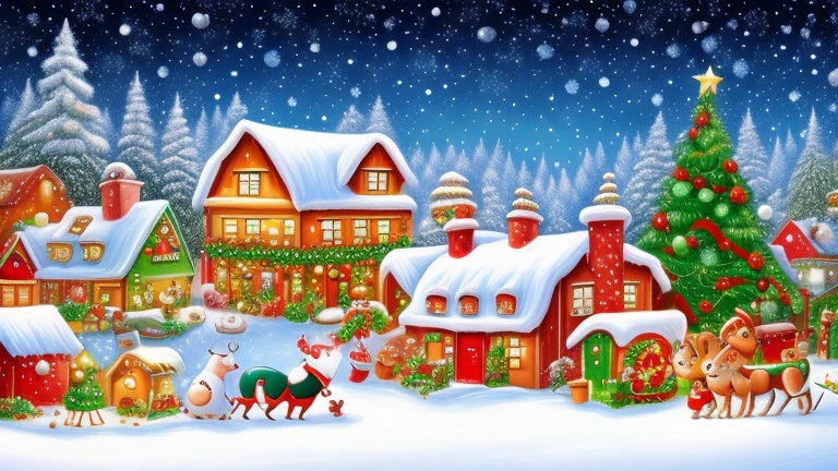 Draw a cartoon Christmas scene background then draw funny Merry Christmas cartoon animals on background, Solo, ((detailed background)), ((detailed text)), ((highest resolution)), ((highest quality)),
