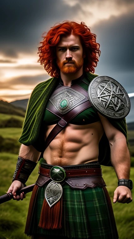 Irish Celtic warrior with red hair, green tartan kilt, Irish Celtic shield, and Celtic sword (((ultra detailed)))