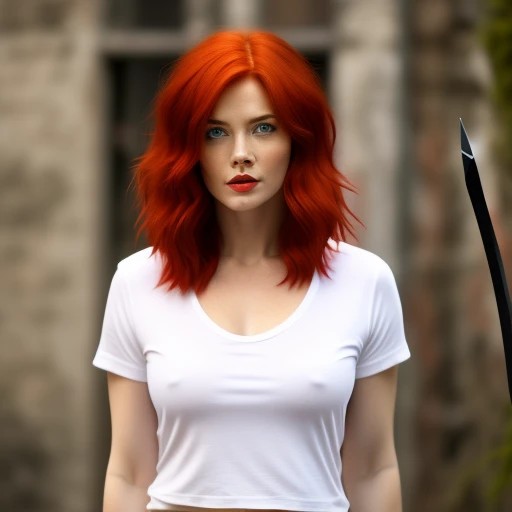 A irish woman, red hair, white t shirt , arrow plunged into chest