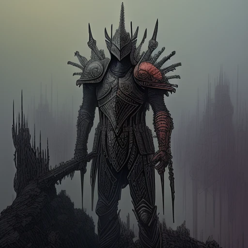 philippe druillet,enki bilal,moebius inspired french comics, bird's-Eye View of a man knight armor, resting in a haze of smoke, dust, eerie colored gas fog, , g1g3r, , distinct contrast in colors and textures, grainy texture,surreal