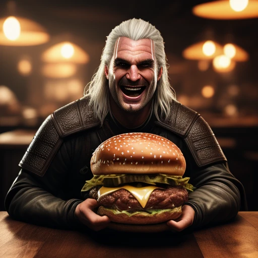 Geralt serving a giant hamburger, ((laughing)), cinematic lighting, film grain