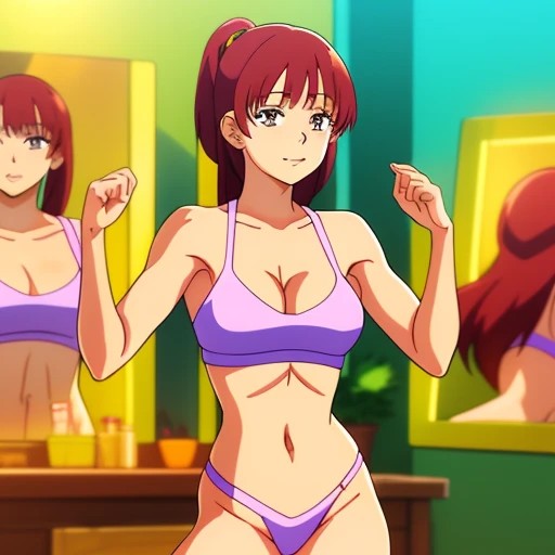 Emma is looking at her fit body in the mirror, نرم, شهری