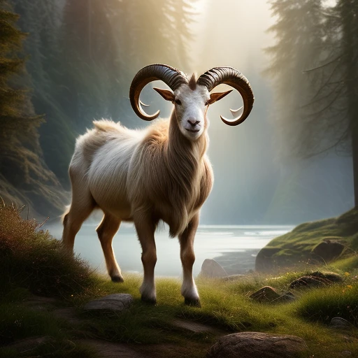 CAPRICORN "horned goat" is the tenth astrological sign in the zodiac in 3d, ((photo-realistic)), ((uhd)), ((detailed)), ((muscular ram goat with large horns))