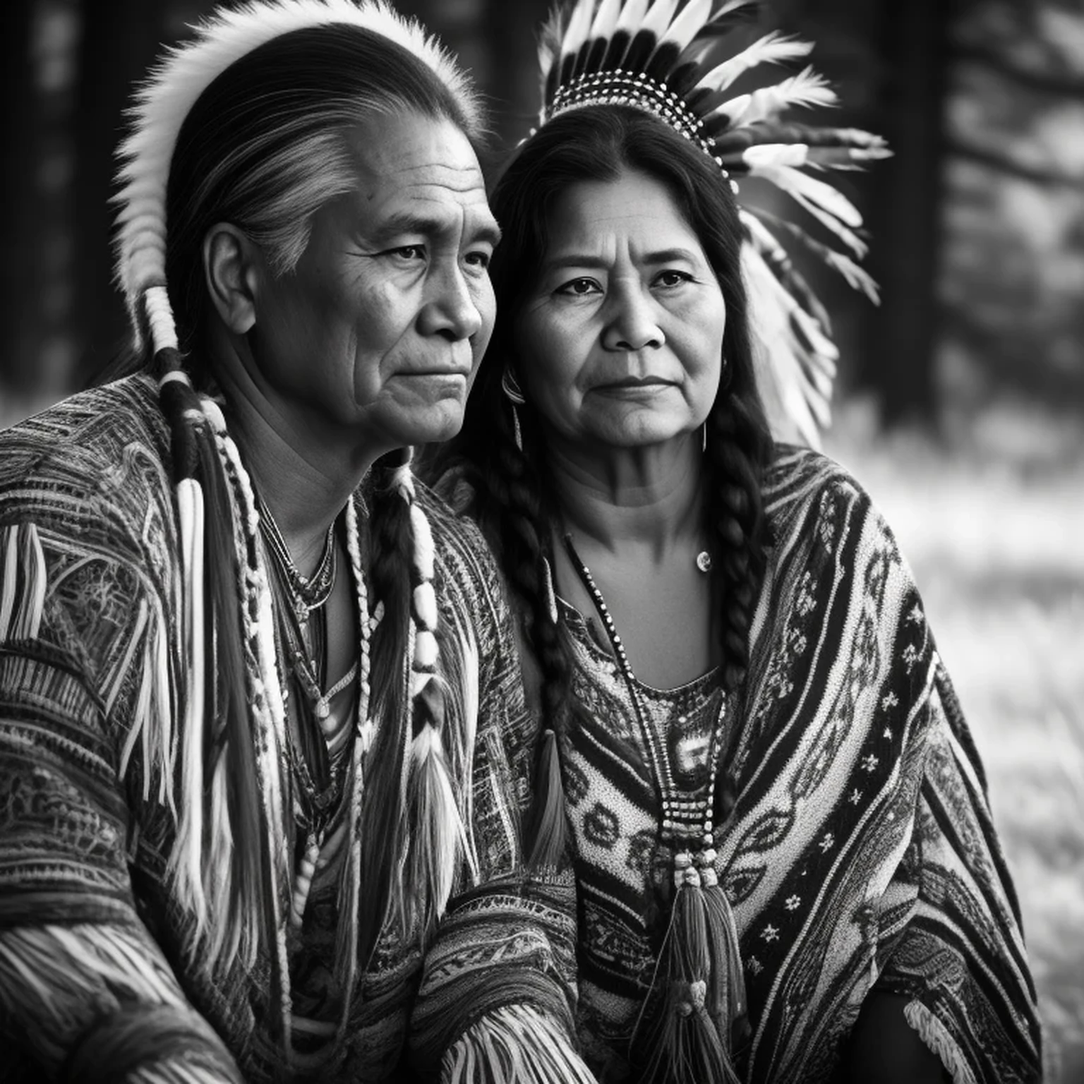 hyper-realistic B&W photograph, native American Cheyenne woman and man in their 50's. a slight smile, looking away from the camera, embodying the resonance and depth of indigenous culture, in the style of photorealism,