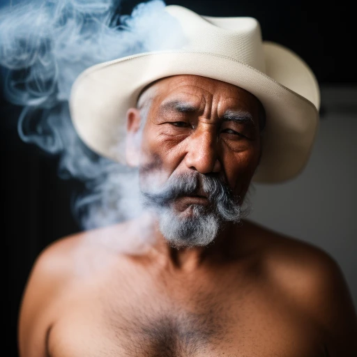 old man smoke and the smoke goes out from his mouth in shape of a white buffalo
