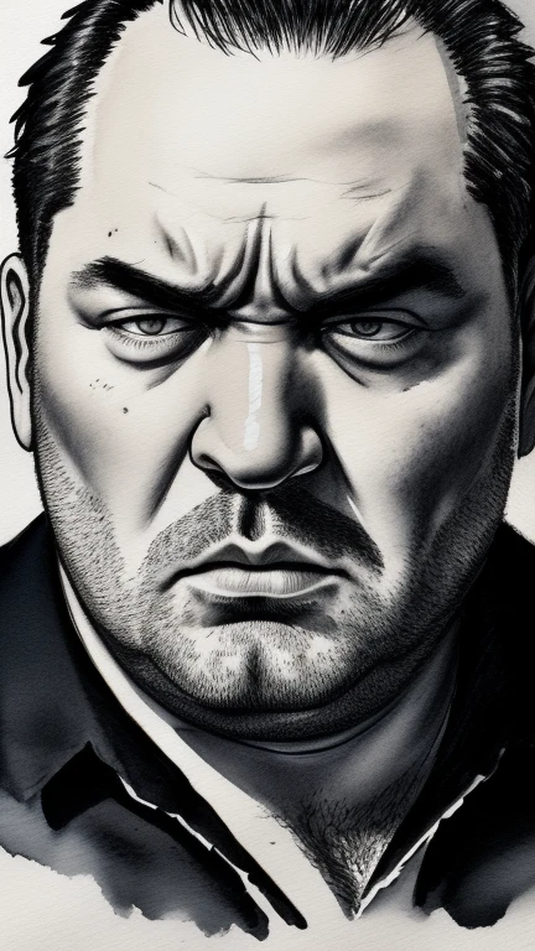 Angry chubby man close-up portrait, Figurative, Watercolor, Minimalism, Rough, Midnight black, Underlit, Film noir, Frank Miller, Rough