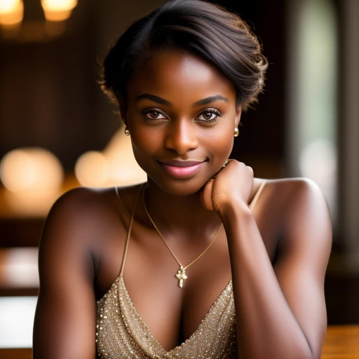A very dark skinned woman with a lovely smile seated at a cafe table, ((photo-realistic)), ((uhd)), ((down blouse cleavage view)), ((action poses)), (((zoomed in : 1.20))), ((highest resolution)), ((highest quality)), ((highest detail)), ((sharp focus)), (Perfect Face - [ Eyebrow, Eye, Eyelid, Nose, Mouth, Lip, Teeth, Scalp, Throat, Hair ] )), ((Perfect Limbs - [ Shoulder, Chest, Arm, Elbow, Forearm, Wrist, Hand, Finger, Fingernail, Thumb ] )), ((Perfect Limbs - [ Leg, Thigh, Knee, Calf, Foot, Ankle, Toe, Toenail, Buttocks, Hip, ] )), ((detailed jewelry)), ((black as really dark chocolate skin tone)), ((pixie cut hairstyle)),