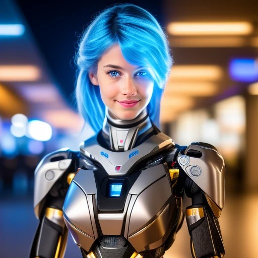 a humanoid robot with very friendly and happy face with blue eyes. around 30 years old. with combine of electronics and organic parts.