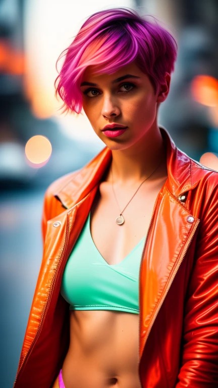girls orange pixie cut hair green bikini tight denim jacket at home