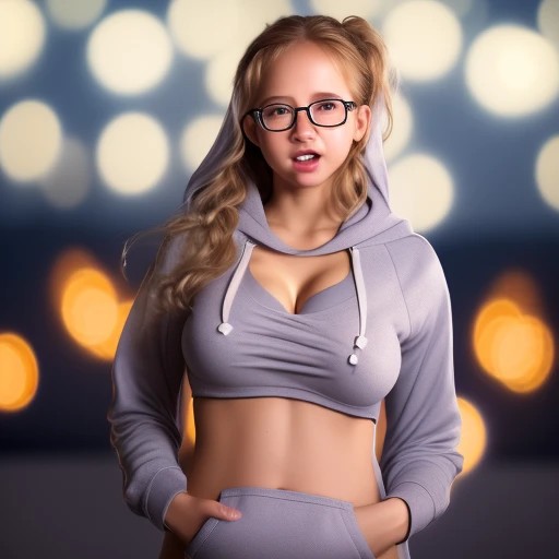 (8k, RAW photo, best quality, masterpiece:1.2), (realistic, photo-realistic:1.37), best quality, ultra high res, photon mapping, radiosity, physically-based rendering, 1girl, ((glasses)), ((hoodie)), ((sweatpants)), naughty face, cute, (laughing), (happy), (Kpop idol), (aegyo sal:1), ((puffy eyes)), looking at viewer, posing, (full body), large breasts, busty, large butt, cityscape, night, (bokeh:1.4), , ((wink)), ((hair blown by air)),