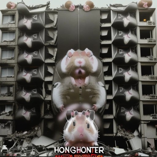 japanese movie poster in the 1960s,(a huge hamster breaks the building:1.7),(giant hamster:1.6),(men and women who run away in the foreground:1.2),(facial expression of fear:1.5),(giant hamster:1.3),the face of a man and woman with another cut in the lower right right,modern building,(beautiful actress:1.3),(actress shouting:1.3),(boyal actor:1.1),actor to point,scientist with black eyepatch,people who run away,