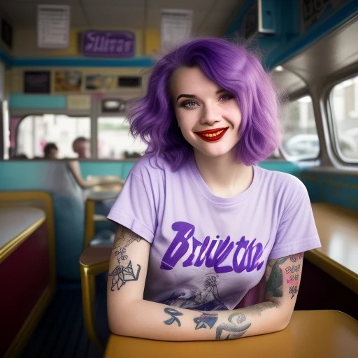 street photography photo of a young woman with purple hair, smile, happy, cute t-shirt, tattoos on her arms, sitting in a 50s diner