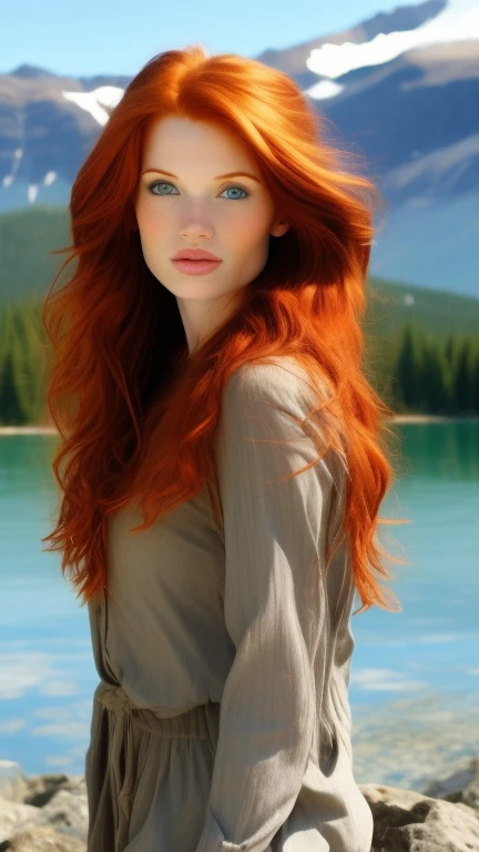 pretty redhead women with mountain and lake behind