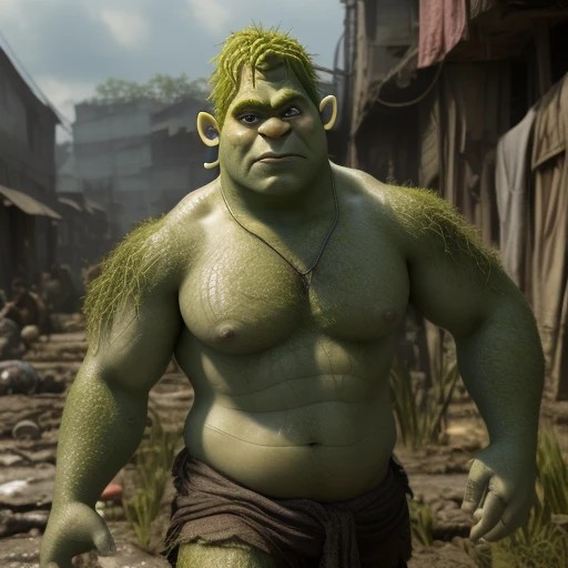 Highly detailed, High Quality, Masterpiece, beautiful, 1boy, solo, SaltBaeMeme, , salt, sunglases, shrex, green skin, ogre, shrek, , slums, dirty, topless,