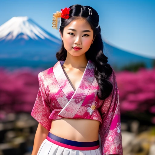 Beautiful young geisha girl wearing miniskirt with Mt. Fuji in the background