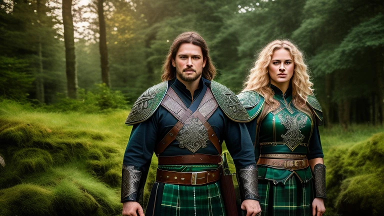 Irish Celtic female and male warriors with green tartan, Irish Celtic shields, Celtic swords, (((ultra detailed)))