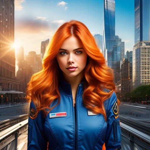 (masterpiece:1.4), (best quality:1.4), futuristic urban cityscape, hyper-detailed, illustration, bright natural lighting, 20 years old female pilot, orange hair, sleek medium-length cut, modern pilot uniform, confident posture, advanced aircraft silhouette in background, fusion of futuristic and contemporary architecture, skyscrapers, clear blue sky, (perfect_face), standing in bustling city, vibrant atmosphere, empowerment theme, (Photorealistic), (Detailed Face), (Vivid Hair Color), (Detailed Uniform), (Dynamic Pose), (4k), detailed_background, city life vibrancy, (uhd).