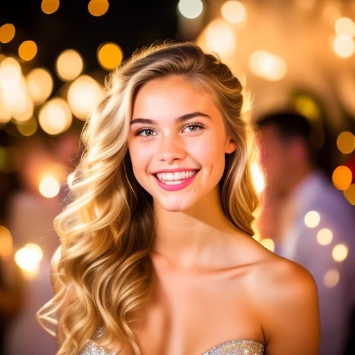 New Years Eve Fireworks Celebration Party Revelers (young woman and boyfriend) Dancing in foreground ((Over-the-Shoulder Shot)), ((perfect smile)),((perfect teeth)), ((action poses)),