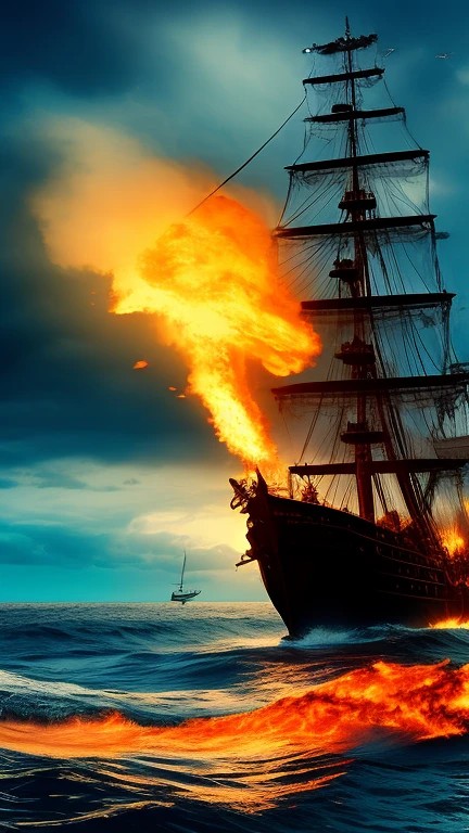 a pirate ghost ship on fire, endless sea, drama, horror,