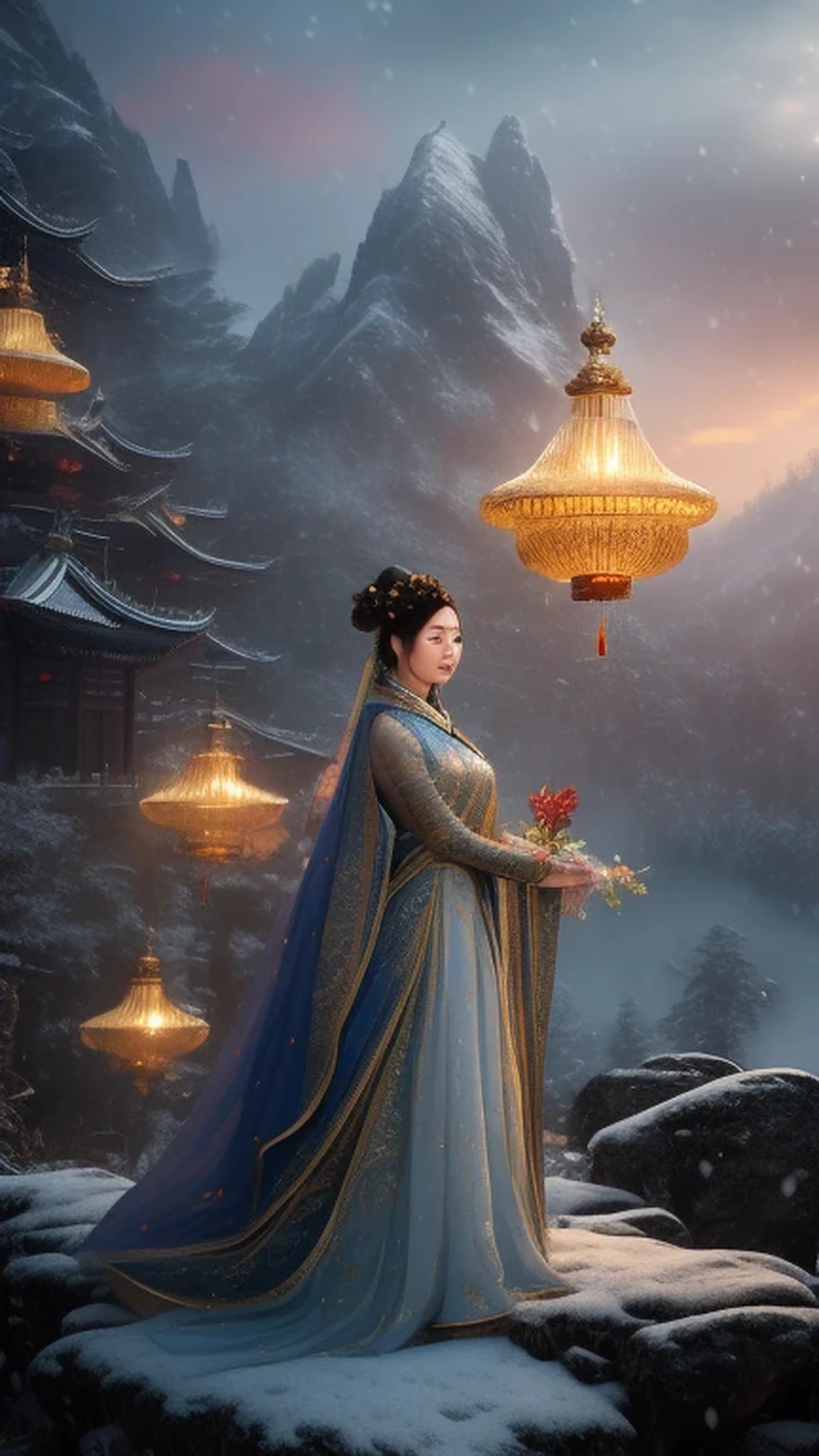 Extremely-detailed and (((in-focus))) photorealistic, [[[2 Chinese women]]], traditional dress, standing, 25-years old. [[sharp rendering]], in a snowy landscape, painted in traditional Chinese way