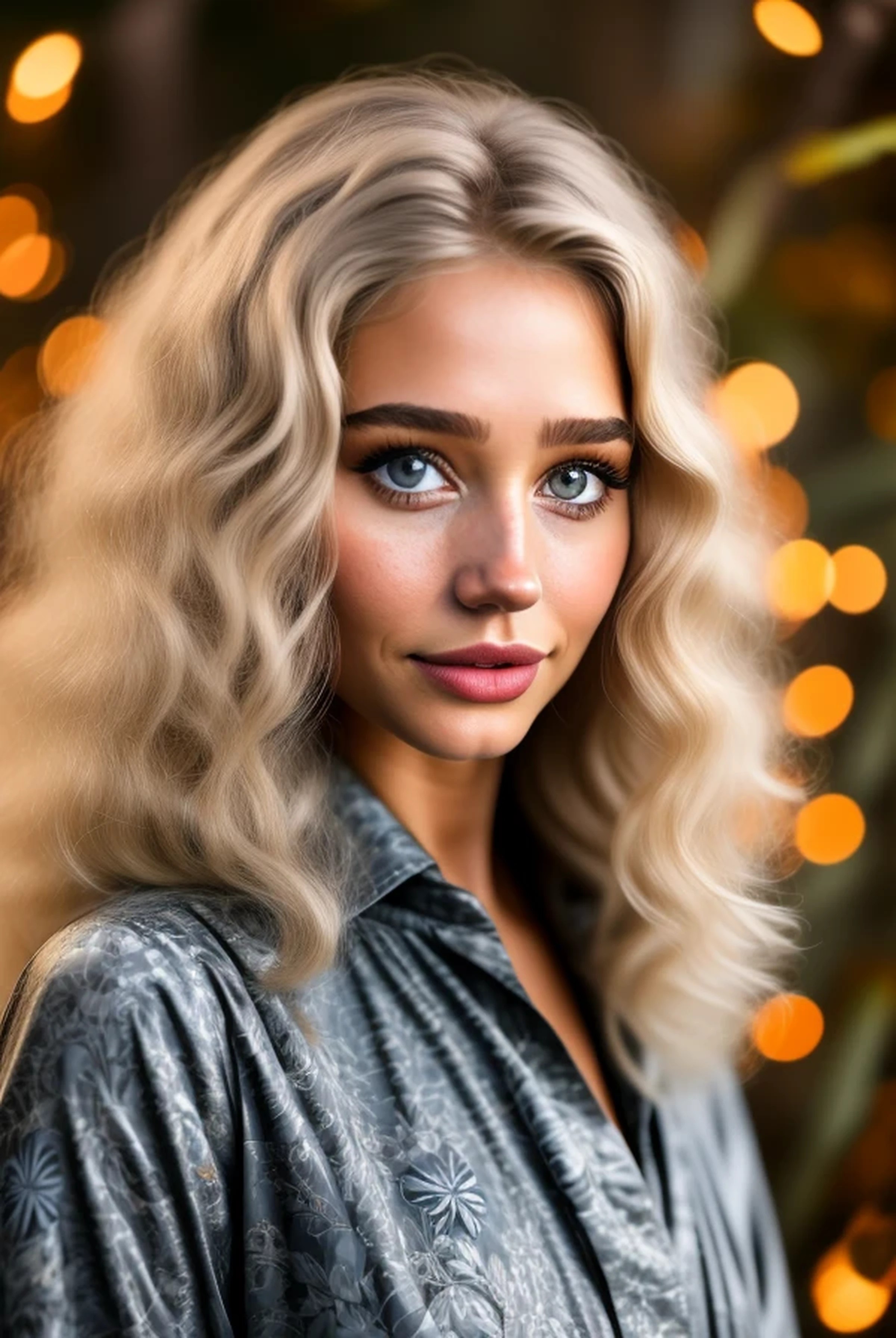 (((8K UHD Irving Penn-style extremely natural, realistic portrait, focused on the subtle aspects of the captivating eyes; perfectly-coiffed hair; and dark, sultry eye makeup of a stunning young woman))). (((Picture has exceptional image quality: edge-to-edge sharpness; superb fabric detail; natural skin tones and detailed skin texture and makeup sheen))). A glamorous woman with unusually large ((((pale blue-gray eyes)))) and ((((a smile that's a cross between the smiles of model Felicity Jones:0.6 and model Noelle Brown:0.7)))), dressed in (((a beautiful gray silk dres printed with a bright and colorful floral pattern))). Her (((beautiful eyes are enhanced with a boldly theatrical amount of glamour eye makeup))): ((dark bronze eye shadow, non-clumping black mascara, and an extra-thick line of black eyeliner)). (((Perfect eyes, matching in size, shape and color))); (((large, round, centered pupils with clear edges; dark outer edge of irises is a uniform thickness on both eyes; eyelids overlap edges of irises; round irises with complex radial striations; flecks of darker gray in the irises; pupils 2/3 the diameter of the irises; realistic and detailed rectangular reflections in both eyes))). She has (((shoulder-length bleached-blonde hair with platinum highlights))), (((tightly permed and curled to produce a profusion of small tight curls, long spiral curls, and very long ringlets flowing over her shoulders))). She is in her early to mid-20s. (((Dark-tone foundation and concealer combine with her extremely dark summer tan to produce a swarthy and flawless dark-hued complexion))). Facially, she's a mix of (Léa Seydoux 1.8), (Zooey Deschanel 1.8), (Brittany Murphy 1.9), (Ellesse Cheale 1.8), and (Lindsay Wagner, circa 1973 1.9), with (the nose of Olivia Newton-John 1.9) and (the mouth and prominent, buck-tooth top front incisors of Noelle Brown 1.5). (Lips are relatively thin and natural). She also has ((((significant dark puffiness under her eyes)))).