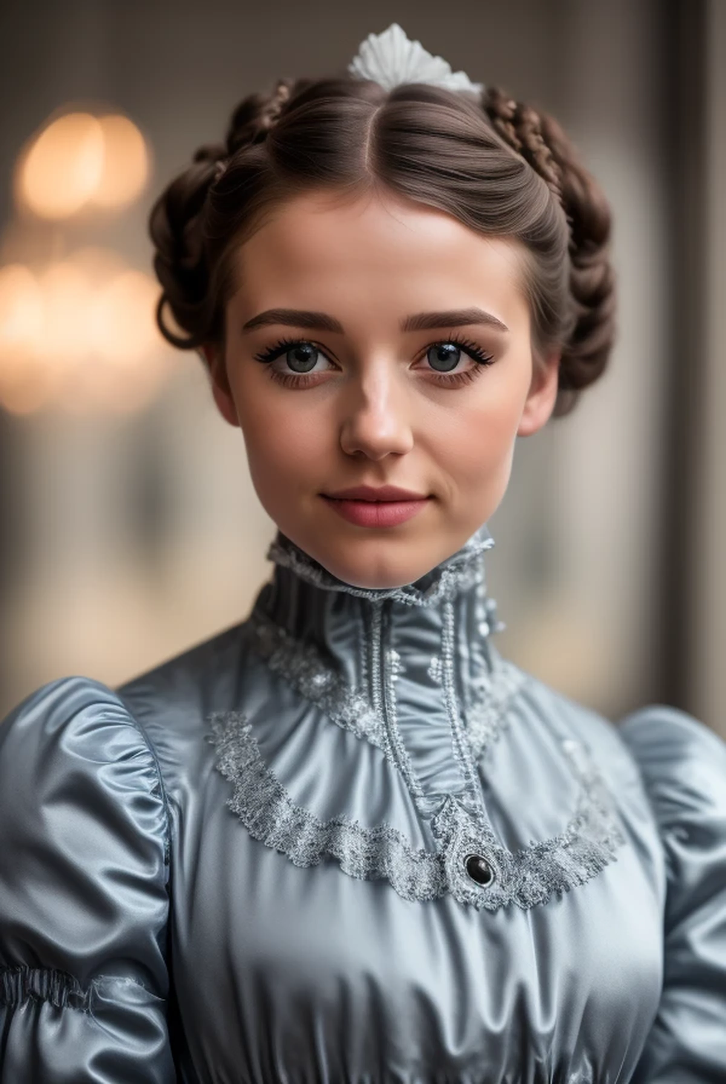 (8K UHD 12mm wide-angle full-body shot, with soft, diffuse misty morning light) and (((the subject in tack-sharp focus))) of a ((((young woman with pale, blue-gray eyes)))) wearing a (((((chantelle Victorian-era ball gown in midnight-blue))))). ((The image brings her glamour-model makeup into sharp focus)): (((((gleaming, metallic dark-bronze eye shadow giving her the coveted "smokey eye" look))))); ((((extra-wide black eyeliner that extends 1/4" past the corner of her eyes, and which outlines her lower eyelids as well)))); (((non-clump mascara on long, curled lashes))). ((Teeth have some yellowing)). This is the most detailed image of a face that Stable Diffusion can generate, so even the hairline shows individual hairs; the stroma in the irises can be seen; and reflections in the eyes match up)). ((((She has her hair in a classic Victorian-era updo, with lots of tight curls -- all in extremely-fine detail, and with the lighting conducive to photorealistic results))). She has ((blue-gray eyes)) (which are perfectly formed 1.8) with (perfect round irises), (round, dark pupils) and ((shiny, highly-reflective corneas)). She is in her early to mid-20s. Facially, she's a mix of (Vera Farmiga 1.9), (Melanie Laurent 1.7), (Ellana Bryan 1.9), (Noelle Brown 1.9), and (Natalia Dyer 1.3), with (the mouth and teeth of Felicity Jones 1.1). She has ((full, sensual lips)). She also has (((puffiness under her eyes, a bluish cast to those bags, and deep lines separating that puffiness from her cheeks))), plus ((normal, average lips -- not thin, but definitely not puffy)), and ((((an overbite with the top central incisors misaligned and set slightly in front of the rest of the row, giving her a slightly buck-toothed look that's immediately apparent)))), ((((very similar to teeth of model Noelle Brown, circa 2016)))). (((She has long, fine eyelashes, rendered so they appear to stick out beyond the eyelid))).