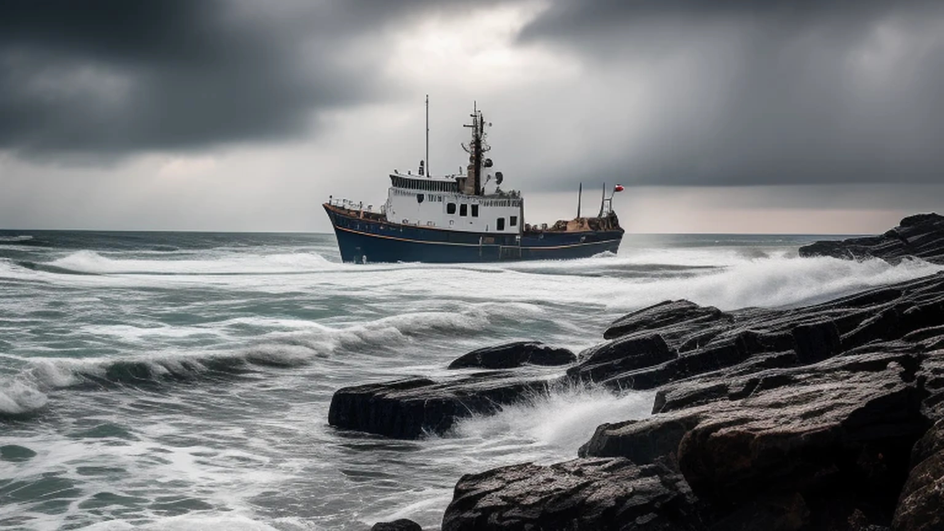 rocky seashore with tornado in the background, ship wreck of trimaster warship 18th century in the foreground, ultra-realistic, black and white, panoramic, high resolution scan, canon 5D