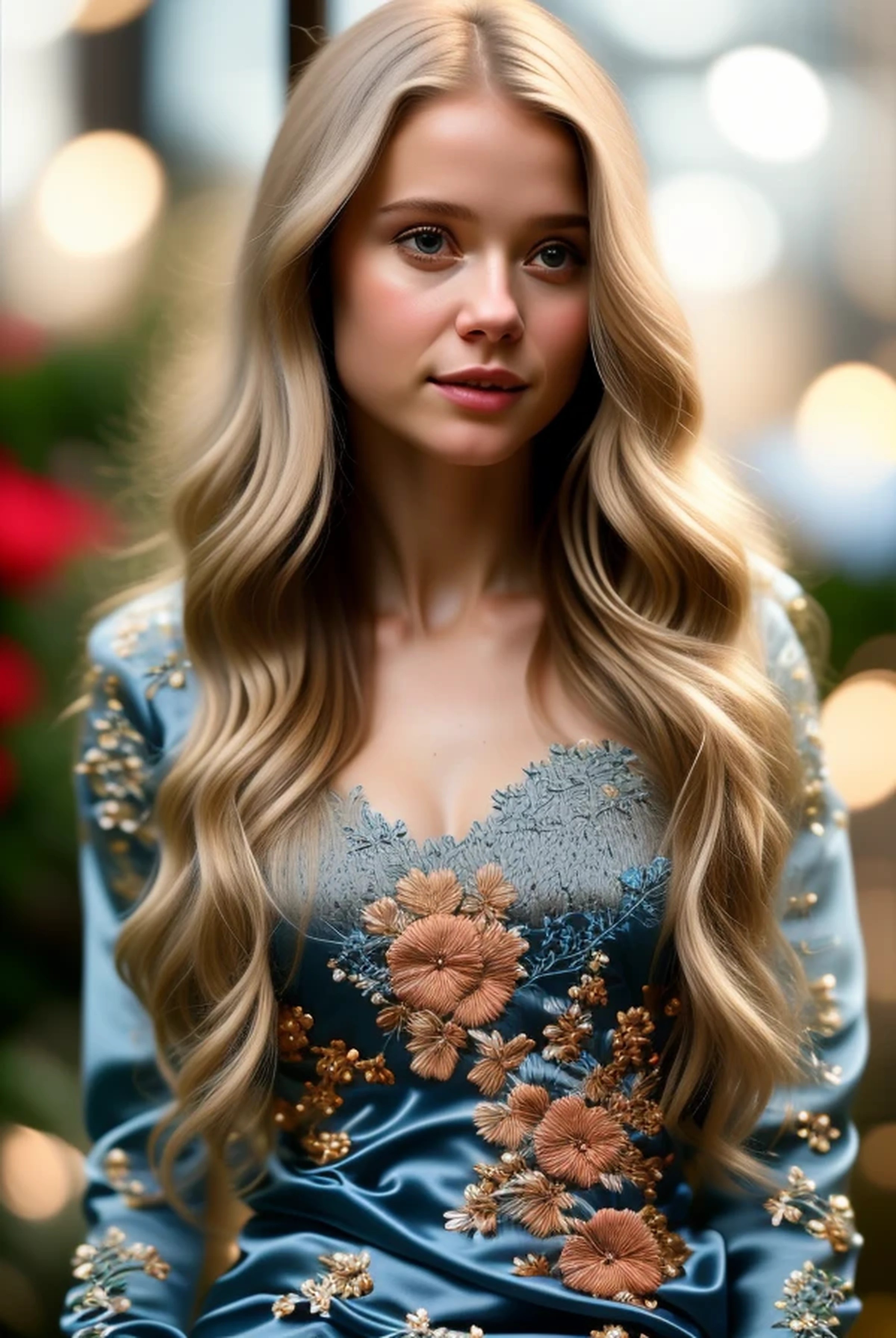 ((((Hyperrealistic extremely sharp 8K UHD extreme facial close-up; superbly-detailed with face and clothes in sharp focus; diffuse natural sunset light; close-up, tightly focused on the face)))), and showing off (((((every tiny and subtle detail of her intricate eyes, complex irises, and sultry eye makeup))))). (((85mm f/9, tight framing with superb macro-lens skin texture detail))), including (((wavy radial stroma in her irises))). (((Close-up of a smiling Caucasian woman)) with (((beautifully silky, shiny, waist-length silver-gold hair: salon-dyed so the extremely long shag cut consists of alternating layers of bright platinum and deep golden, giving it tremendous color contrast, color depth, and complexity))), with (((very long, curled bangs almost completely hiding her eyes))). She has (((unusually large, round eyes that are pale blue-gray in color -- eyes which dominate her face with their ethereal beauty))), and are enhanced with ((a wide line of black eyeliner)) and (((dark bronze eye shadow for a classic and sexy "smokey eye" look))). ((Pale-toned foundation gives her skin a milky, soft flawless look, with bronze blush on her strong cheekbones)). The woman is in her early 20s, and (((((wearing a Veni Infantino midnight-blue satin dress))))), ((((((embroidered with a delicate dark-blue floral motif))))). (((She is tall and slender,)) with (a runner's build -- lean, with a well-defined musculature -- and natural D-cup breasts). Facially, she's a mix of (Léa Seydoux 1.8), (Agnetha Fältskog 2.5), (Helen Slater 2.5), (Ellesse Cheale 1.8), (Zooey Deschanel 1.8) and (Natalia Dyer 1.9), with (the nose of Olivia Newton-John 1.9) and (((upper front incisors that are set in front of the rest of the row, making them appear both larger and more prominent, almost like buck-teeth))). (Lips are relatively thin and natural). She also has ((((significant puffiness under her eyes, like she is severely sleep-deprived)))), plus ((full, but natural lips)).