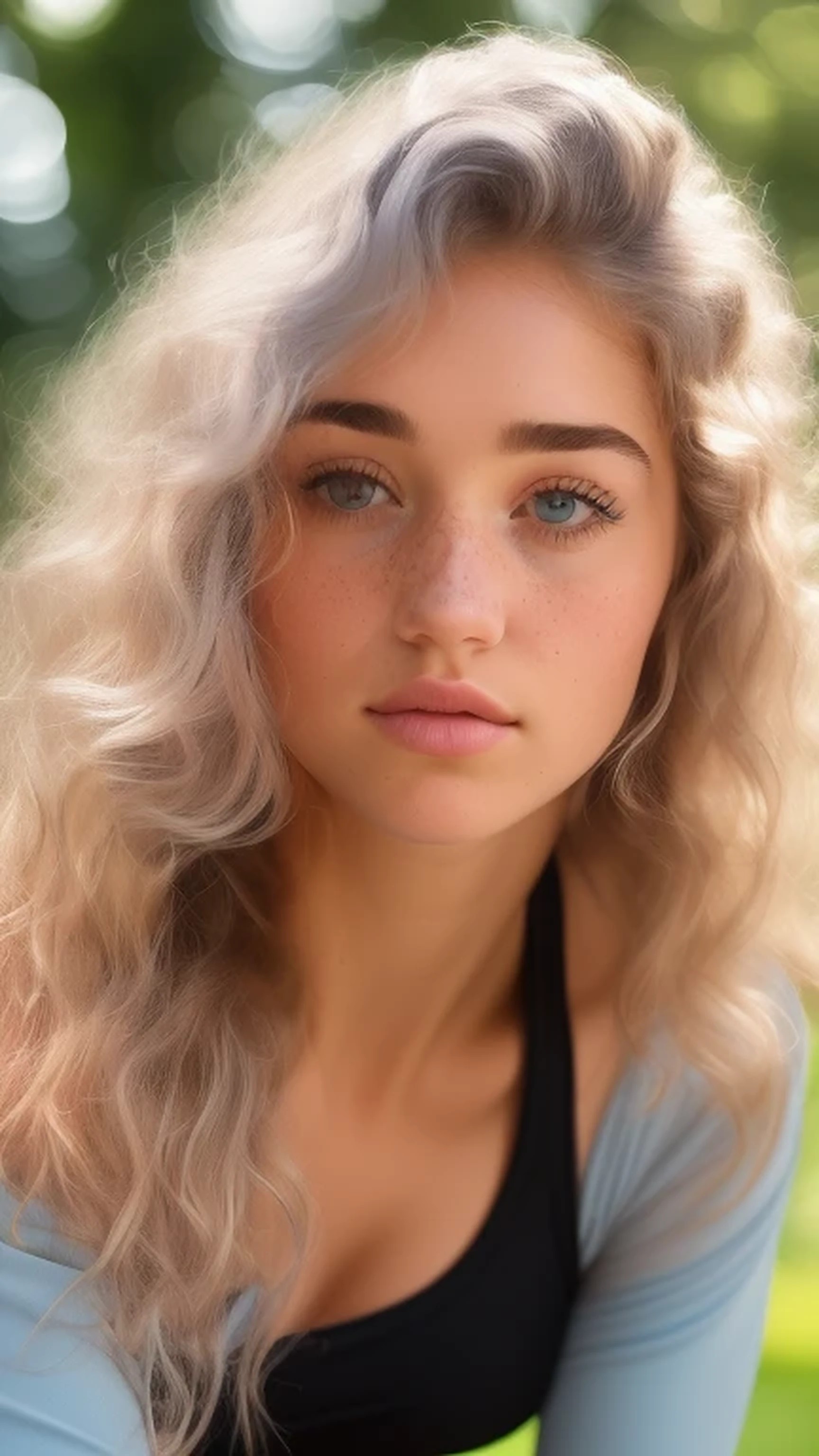 (Highly-detailed Associated Press close-up portrait 1.9) of a young ((Caucasian)) woman in a park. (Her shoulder-length brown hair has been permed and teased, bleached and cut), turning it into (a light blonde Afro 1.8) -- a spectacular nimbus of pale golden frizz lit up by the summer sun 1.8) and forming (a halo of extremely tight, kinky curls around her head 1.6.) (The hair is kept out of her face via a black hair band 1.4.) (((She has prominent pale blue-gray eyes, which feature dark, round pupils rimmed by the wavy blue-gray marbling of her irises))), and are topped by (high, gently arching eyebrows the same shade as her hair 1.5). The woman is in her late teens, dressed in a (((black lycra sports bra))) and ((lycra running shorts)). ((She is tall and slender,)) with (a runner's build -- lean, with a well-defined musculature -- with modest B-cup breasts 1.8). Facially, she resembles a cross between (((Ellana Bryan))), ((actress Olivia Cooke), (a young Adrianne Palicki 1.7), (a brunette Desire Inglander 1.5), (newscaster Jadiann Thompson 1.9), ((Elizabeth Turner circa 2020)) and ((Natalia Dyer)). She also has (((visible puffiness under her eyes, a bluish cast to those bags, and deep lines separating that puffiness from her cheeks))), plus ((full, sensual lips)), and (a light sprinkling of very light, indistinct freckles across her cheeks, nose and chin with the concentration heaviest on her nose 1.6), and ((a slight overbite that exposes the bottom half of her upper front teeth a bit more)). She has long, fine eyelashes, and the eyebrows are detailed enough to make out individual hairs. The outline of the eyebrows is not perfectly straight, showing variation in the edges and the thickness. (Her lips show fine vertical lines, and are natural in color -- no lipstick or lip gloss -- just the slightest bit pinker, darker and more corrugated than the surrounding skin). ((Her skin has visible blemishes and imperfections that keep her skin from being totally smooth.))