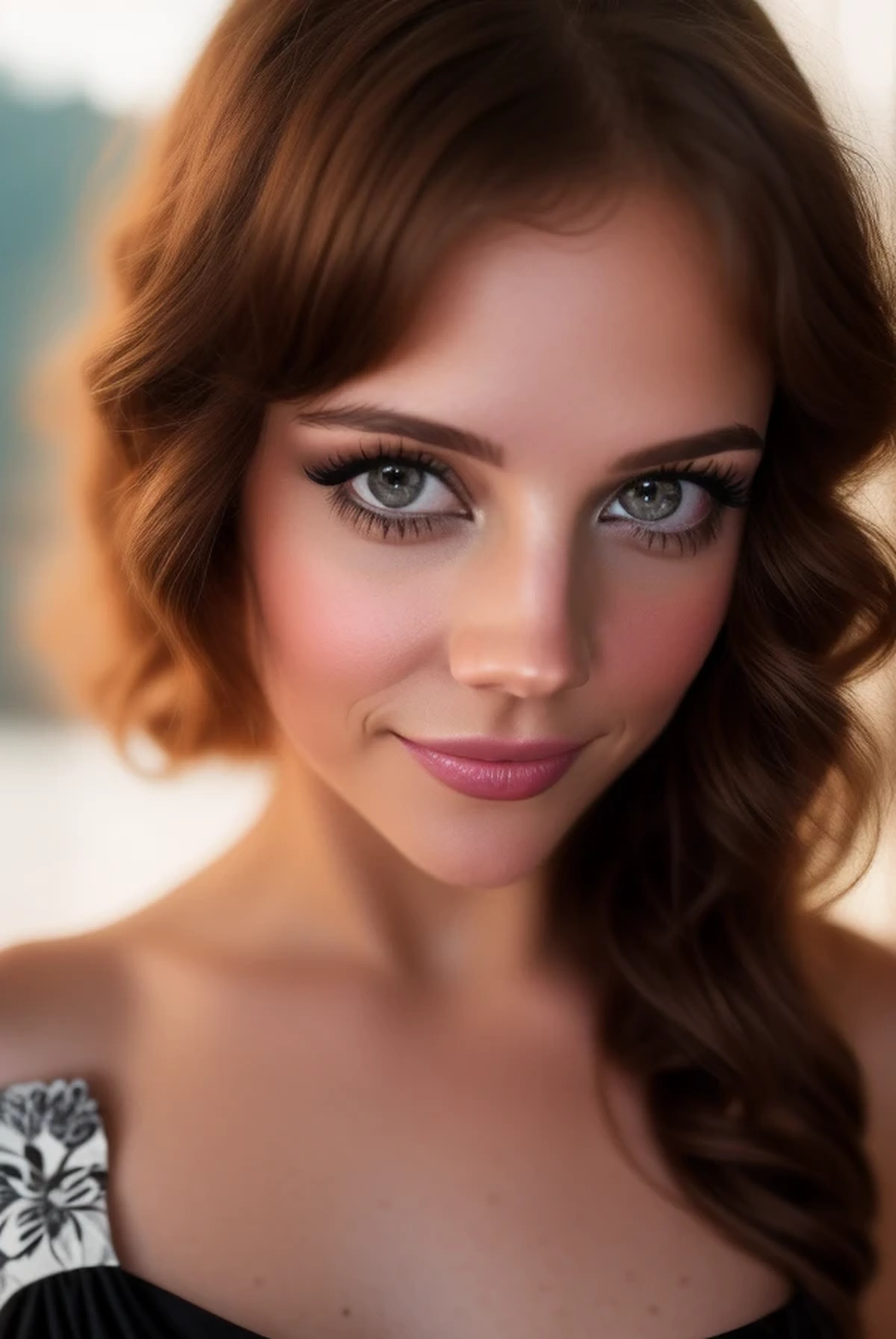 ((8K UHD extremely-sharp and revealing facial close-up, zoomed-in for minute, precise details)); (low-angle sunset light; NYC Central Park background) of (((a strikingly pretty brunette woman with pale, seawater-gray eyes))). ((((She is dressed in a tight black silk dress printed with a monochrome dark-gray floral pattern)))) and (((cover-model glamour makeup))), with (((intense 1980s-style dark eye-shadow))). She is ((smiling seductively -- a coquettish smile)) and has (((large, round, hypnotically beautiful pale eyes, as she looks directly at the camera))). Eyes are (((perfectly shaped, with round irises; dark, round pupils that have a diameter 40% the diameter of the irises; pupils perfectly centered in the irises))); ((((detailed stroma -- the radial wavy lines -- are clearly visible in the irises)))). Their beauty is enhanced with (((heavy use of "smoky-eye" eye shadow))); (((black eyeliner rimming the entire eye and extending 1/4" past the outer edge of her eyelids))); ((non-clumping mascara on pressed and curled long, lush lashes)). (((The complex colors and radial striations, or stroma, of her irises are visible, as well as small specks of gray))). (((Light-toned foundation and concealer have given her skin a milky, flawless look, and bronze blush on the crest of her cheeks has accentuated her cheekbones))). She is in her mid-20s, with ((((shoulder-length dark-mahogany hair done up in a precise layered cut giving it a rounded profile, and with long thick bangs))). Facially, she's a mix of ((((Lisa Welchel, circa 1992)))), ((Kathryn Cramer)), (Brittany Murphy 1.4), (Lydia Bielen 1.8), (Hilary Swank 1.6) and (Juli Mery 1.9), with (the perfect high-definition eyes of Elle Trowbridge 1.9), (the teeth of model Noelle Brown), and ((the nose of Olivia Newton-John)) and ((the teeth of Noelle Brown))). (Upper lip is a little less full than lower lip. 1.7) She also has (((puffiness under her eyes, and deep lines separating the puffy lower lids from her cheeks))).