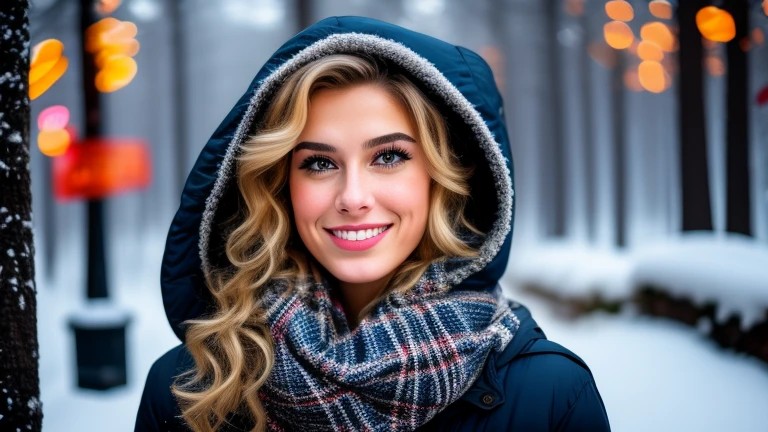 (8K UHD, 50mm f2.8 Nikkor outdoor portrait with bright, diffuse light on a very snowy winter morning) of a young (fair-skinned Caucasian) woman in a heavily wooded park. ((She has shoulder-length, shiny and healthy dark red hair, parted in the center, styled with hair gel, then given a salon blow-out to achieve maximum "big hair" volume))). She has (soft, pale blue-gray eyes 1.8)) with (perfect round irises), (round, dark pupils), (long, thick lashes), ((a thick line of eyeliner 1.9)), and (glittering silver eye shadow 1.8). ((Her eye makeup is heavy, colorful and intense 1.9)) (Liberal use of concealer and dark pink blush on the crest of her cheeks gives her skin a smooth, flawless look). The woman is in her early twenties, and ((wearing a plaid Pendleton wool scarf under a navy blue North Face ski parka with hood 1.9))). (She is tall, slender and athletic). Facially, she's an exact match for (((Lawfare's Anna Bower 1.9))). She has (full, sensual lips, though the upper lip is less full than lower lip). She also has ((puffiness under her eyes and deep lines demarcating the bottom of those bags)), and ((lightly freckled skin, which is just barely visible through her makeup 1.9)). ((She has a significant overbite, with the front two teeth of the top row sit slightly forward of the rest and creating a very slight buck-toothed grin 1.3)). (She has long, fine eyelashes), pressed so the upper ones curl upwards. (Her lips show fine vertical lines and some chapping under dark polished bronze lipstick.