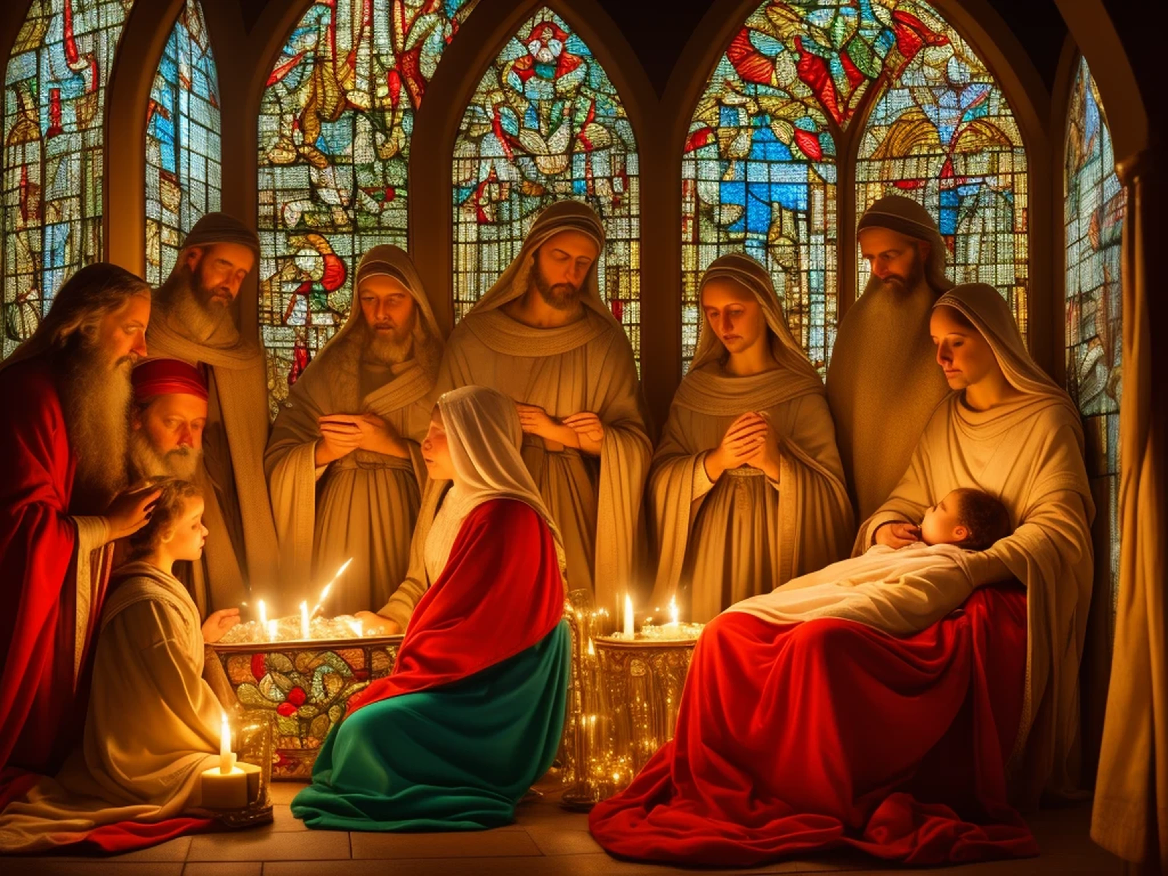 Hyperrealistic stained glass window of the birth of Jesus Christ with the holy virgin Mary and Saint Joseph