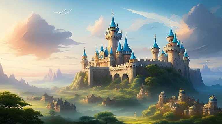 blue castle with hundreds of birds in th...