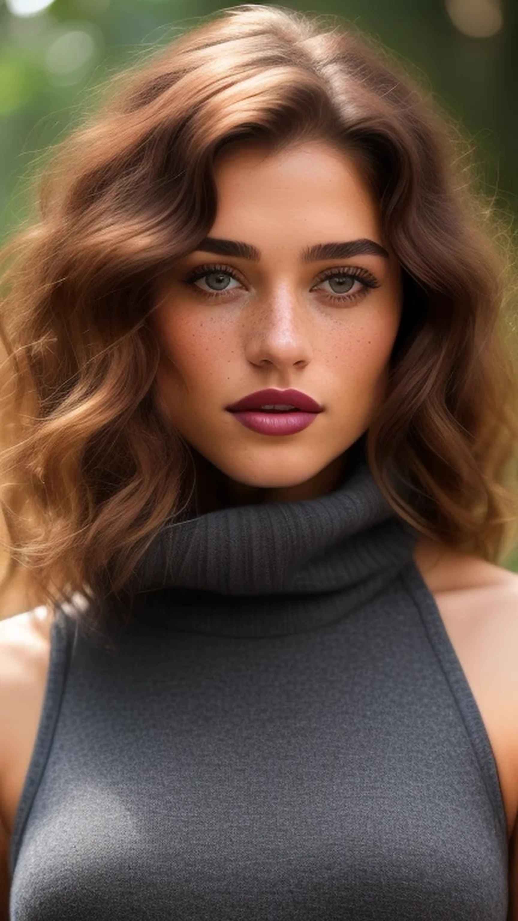 (Extremely detailed Associated Press close-up portrait 1.8) of a young ((light-skinned Caucasian)) woman in a park. She has (((straight, shiny, shoulder-length hair))) that is (a rich, dark reddish brown in color, edging on black 1.6) -- (((a deepest, darkest brunette, like mahogany mixed with obsidian))) (with a dark healthy sheen that makes the hair look oiled and polished 1.9). (She has pretty pale blue-gray eyes, made more prominent by her long, dark lashes, black eyeliner and shiny blue-gray metallic eye shadow 1.9). (Some concealer, and dark pink blush on the crest of her cheeks, enhances her beauty 1.8). The woman is in her early to mid-20s, dressed in a (dark gray sleeveless turtleneck sweater) and black slacks. ((Her skin has visible small moles, but most of the imperfections that keep her skin from being totally smooth have been dealt with via makeup 1.9.)) ((She is tall and slender,)) with (a runner's build -- lean, with a well-defined musculature -- with modest B-cup breasts 1.8). Facially, she resembles a cross between (Ellana Bryan 1.7), (Helen Slater 1.6), (Melanie Laurent 1.8), (newscaster Jadiann Thompson 1.7), (Elizabeth Turner circa 2020 1.2) and (Natalia Dyer 1.3). (Upper lip is a little less full than lower lip. 1.7) She also has (((visible puffiness under her eyes, a bluish cast to those bags, and deep lines separating that puffiness from her cheeks))), plus ((moderately full lips -- not thin, but definitely not puffy)), and ((a light sprinkling of very light, indistinct freckles across her cheeks, nose and chin with the concentration heaviest on her nose 1.8)), and ((a slight overbite that exposes the bottom half of her upper front teeth a bit more 1.5)). She has long, fine eyelashes. (Her lips show fine vertical lines), and are done up with (((glossy dark burgundy lipstick, almost like fresh blood 1.7))).