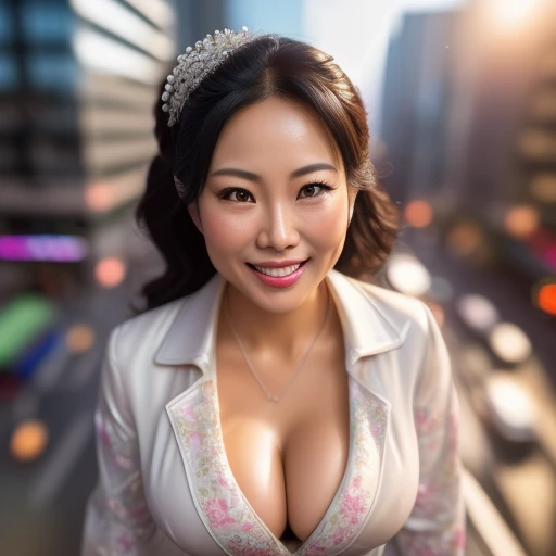 35 year old busty Asian woman looking up smiling at camera lens ((photo taken directly over her with camera lens pointing down)), ((3d)), ((ultra-realistic)), ((action poses)), ((detailed background)), ((detailed bodies)), ((detailed faces)), ((detailed hands)), ((surrealistic)), ((highest resolution)), ((highest quality)), ((clothed)), ((cleavage)), ((high angle shot)),