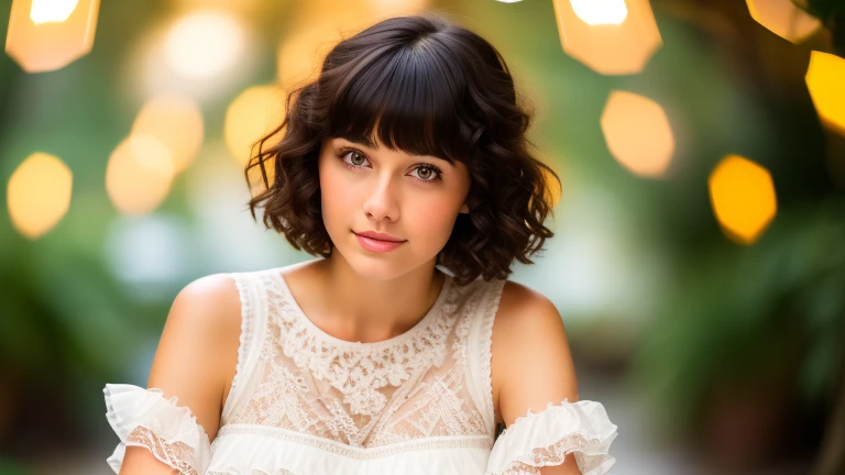 18 year old ((busty)) woman, black haired with a short sharp bob with bangs haircut, wearing a frilly lace dress