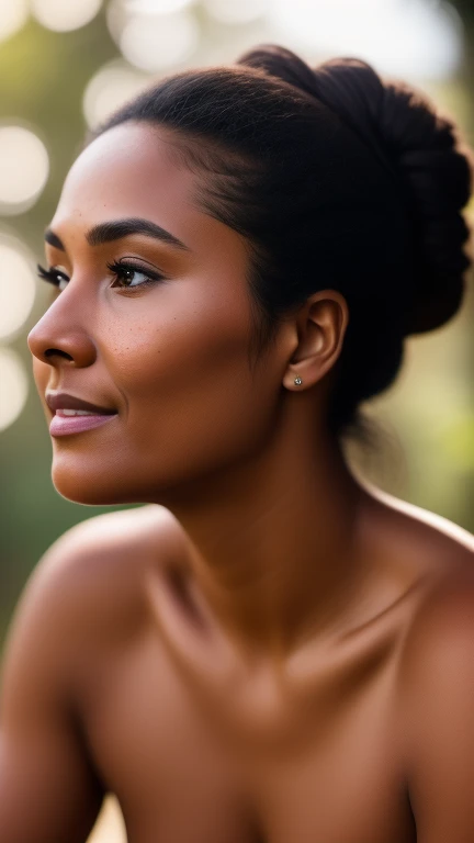 hyper-realistic photograph, woman, a slight smile, side view looking away from the camera, close-up detail, embodying the resonance and depth of indigenous culture, in the style of photorealism, I can't believe how beautiful this is, flawless skin, photorealistic, shot on a Canon A7III