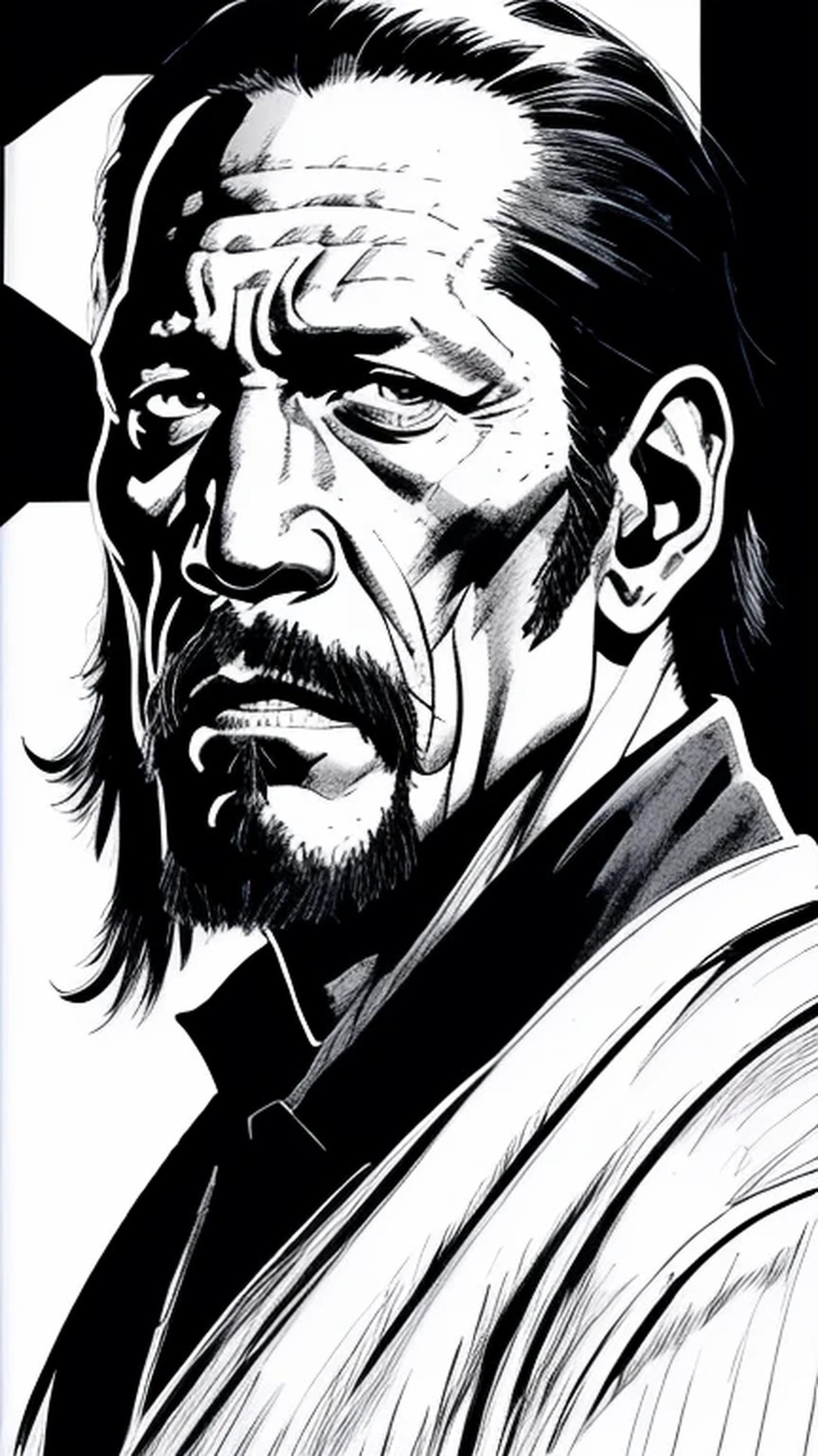 Gray ink digital sketch, Danny Trejo face portrait, Figurative, Minimalism, Midnight black, Under lit, Sean Gordon Murphy, Moebius, Bernie Wrightson, Film noir, Stunningly beautiful